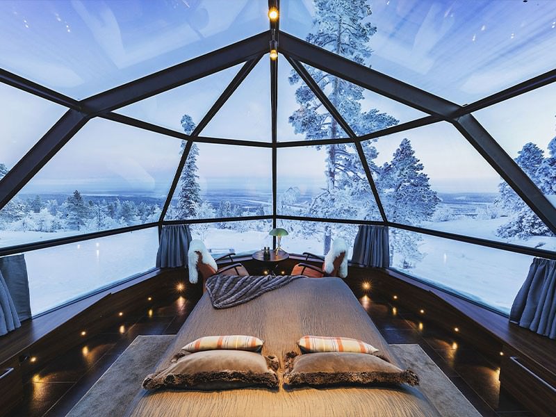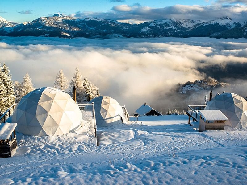 Заказать сейчасИмеют форму полусферы, в диаметре от 3 до 4,5 м, жилая площадь вмещает 2-6 человек. Могут быть с панорамным остеклением или полностью прозрачными. Поставляются металлическим или деревянным каркасом. Можно заказать летнюю или всесезонную модель.