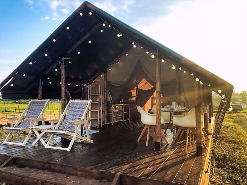 Это полноценные отельные номера со всеми удобствами, но на природе. Строятся такие домики в Молодогвардейске быстро, т. к. крыша и стены – это тент или сборная конструкция. Дома стоят отдельно друг от друга, поэтому жильцы никому не мешают. Одновременно удается быть отдельно от всех и со всеми вместе.