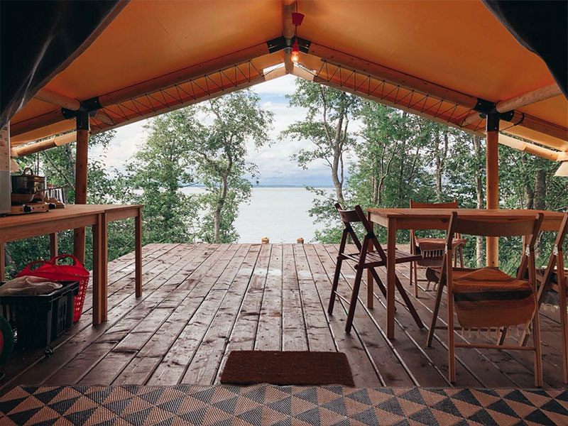 Палатку можно установит на деревянный настил, затем укомплектовать по своему усмотрению: от минималистичного набора мебели до уровня комфортабельного отеля Люкс. В доме можно оборудовать полноценный санузел, веранду, жилое пространство.